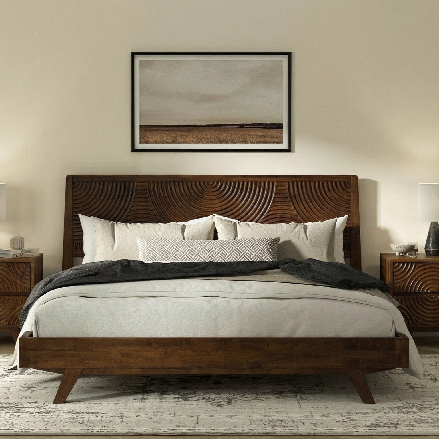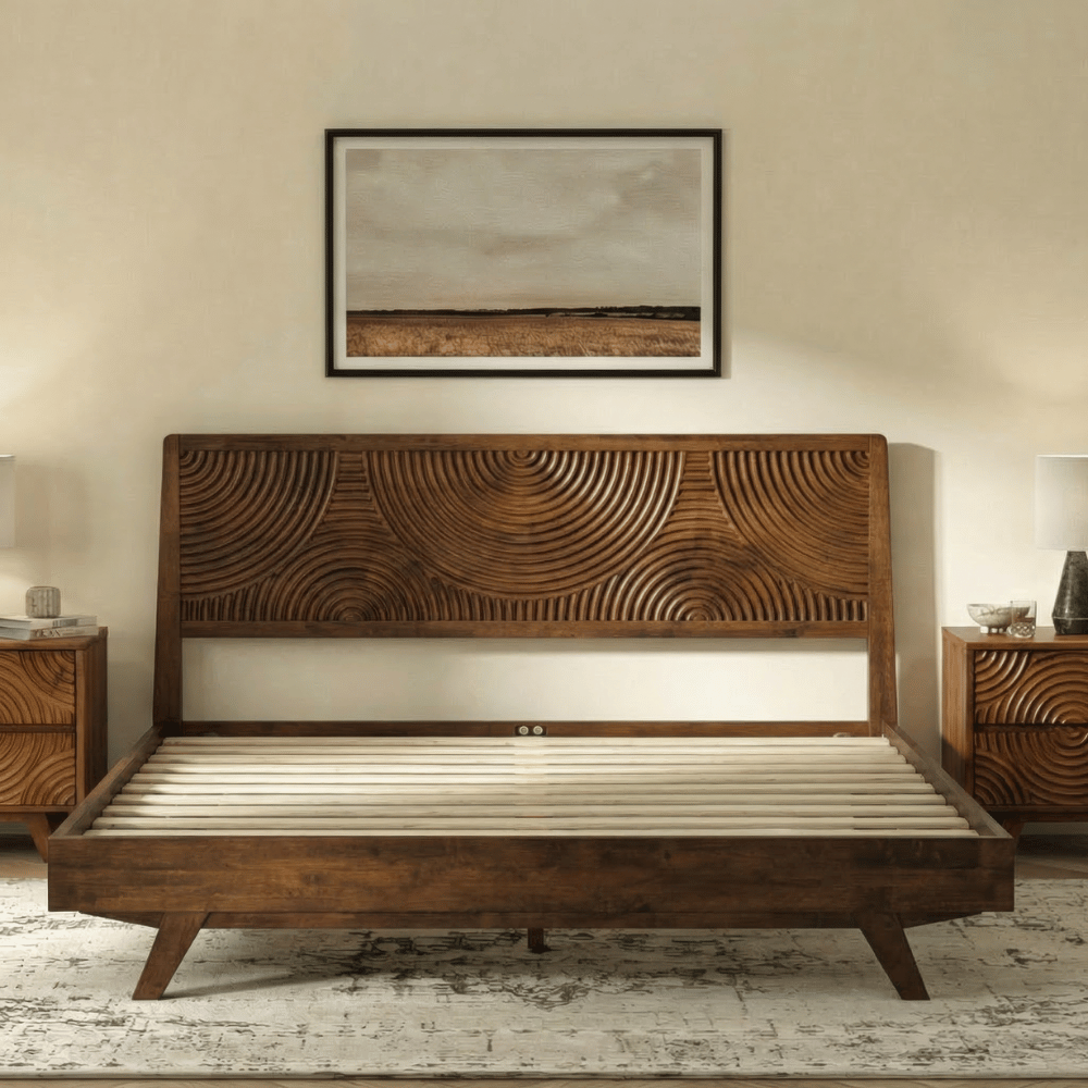 A sculptural statement rooted in nature, this platform bed brings warmth, texture, and quiet elegance to your bedroom. The artfully carved headboard showcases refined craftsmanship, creating a calming focal point that elevates any modern space. Designed for effortless living, it blends timeless aesthetics with everyday comfort, where simplicity meets enduring beauty.